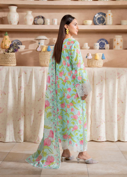• Front: The front is crafted in digital printed lawn, featuring a delicately embroidered neckline and lace daman that adds elegance and finesse.